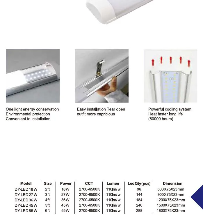 | DY-LED27W | 3ft | 27W | 2700-6500K | 110lm/w | 144 | 900*75*23mm |